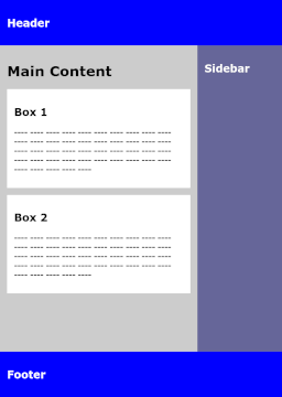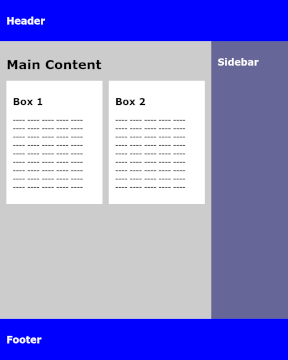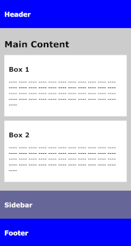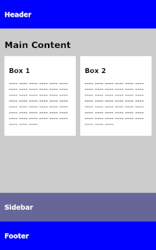 In einem klassischen Layout mit Header, Sidebar, Footer sollen im Hauptinhaltsbereich (im Element main) zwei Textboxen untergebracht werden. Ist der Hauptinhaltsbereich breiter als 480px, sollen die Textboxen nebeneinander, andernfalls untereinander dargestellt werden. Hinzu kommt, dass die Sidebar nur oberhalb einer Breite von 640px neben dem Hauptinhalt, andernfalls unterhalb angezeigt wird, so wie es in einem responsiven Layout sinnvoll ist.